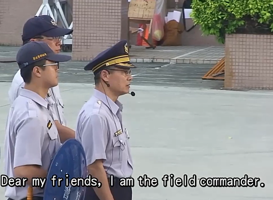 答覆:為因應時勢變遷,若陳抗現場有外國學生或觀光客參與抗爭,該如何處理。黃前總隊長將其構思、理念傳達,交代我在這次的實警示範觀摩演練中,穿插演出。本次的實警示範觀摩演練是動員最多陳抗民眾(總、大、中隊內勤同仁都需參與),最多外勤演練同仁及最多觀眾(南區警友會會友、本總隊警友會會友及其眷屬),參與人數、規模是最盛大的。