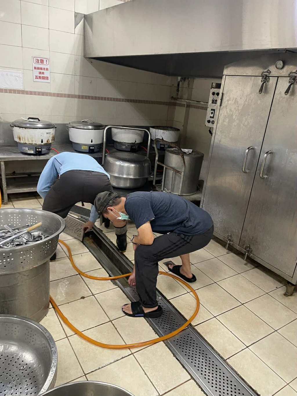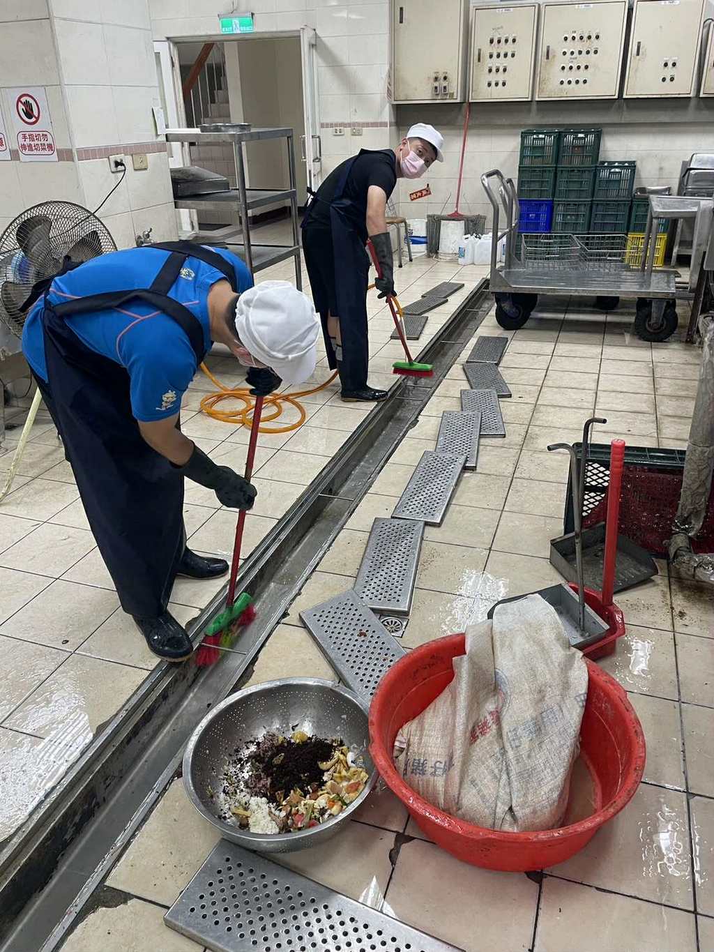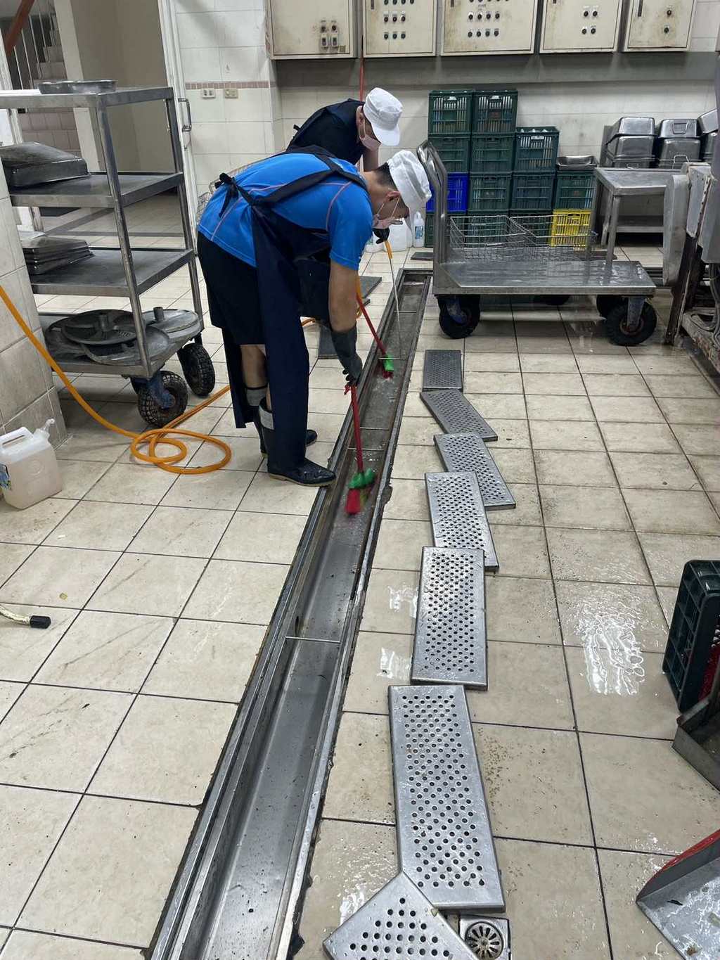 為維護員工餐廳的衛生環境,本總隊於本(12)月1日特別針對廚房及後場區域的排水系統實施大清掃。因累積的油汙及沉澱物使清理難度提高,廚房成員紛紛投入清理,不畏惡臭、油垢與悶熱環境,逐段清理、反覆沖洗,展現高度的團隊精神。