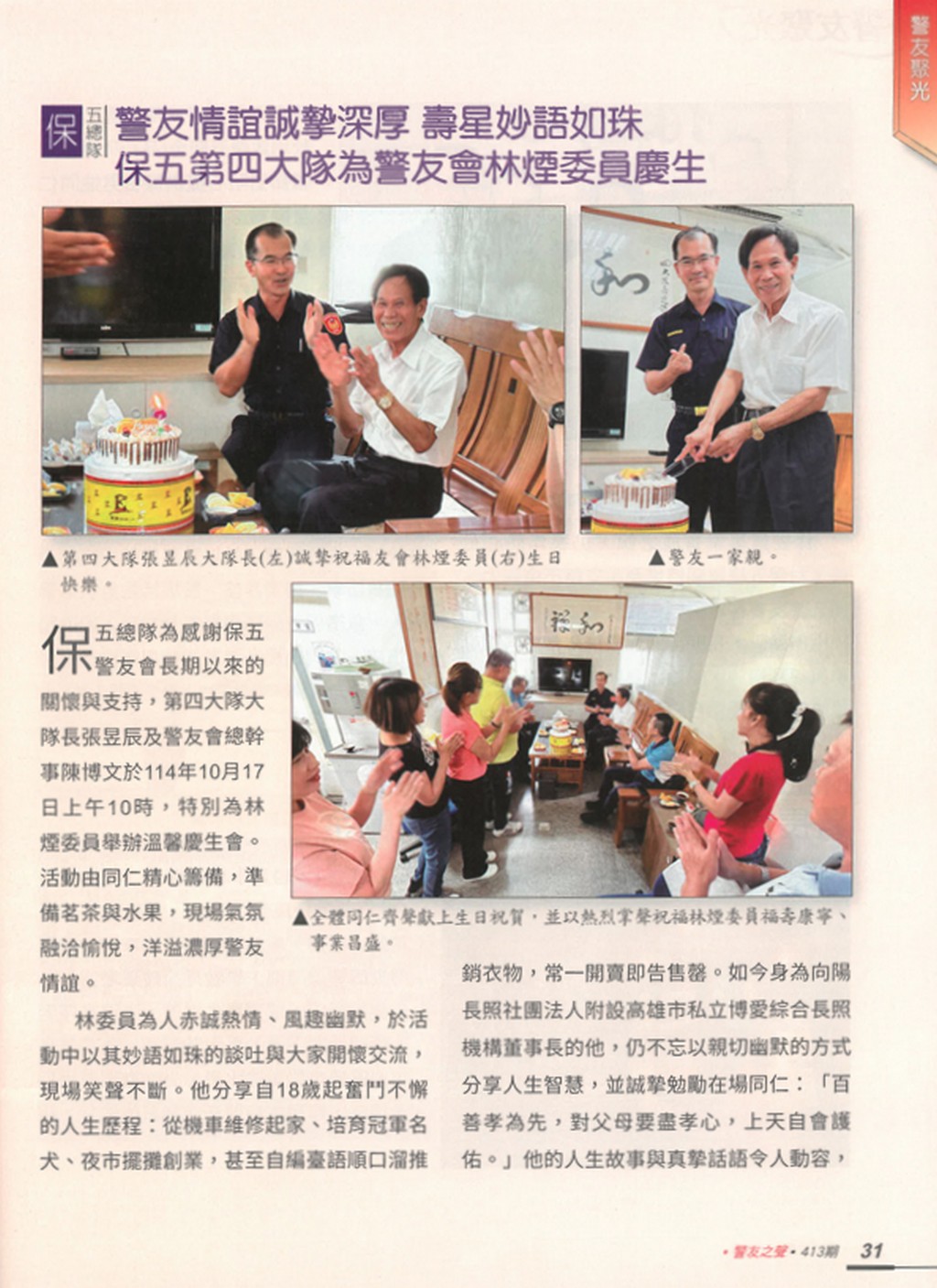 二、溫暖支持:「第四大隊為警友林煙委員慶祝生日會」一文,體現警民最實質且溫暖的關懷與支持。