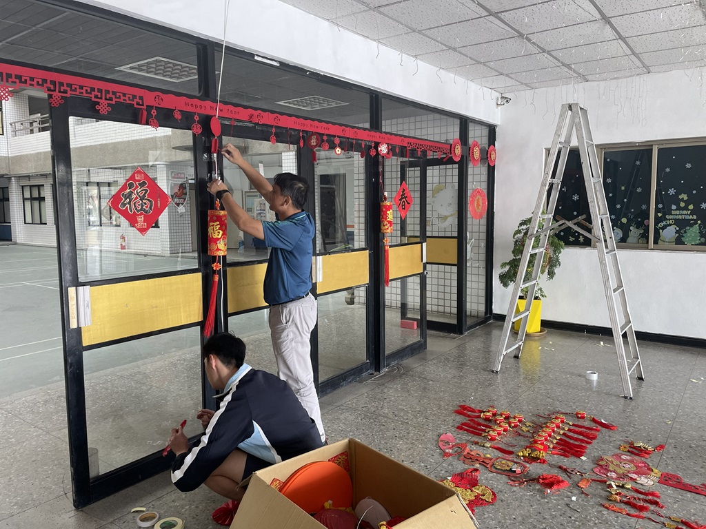 第三大隊為迎接農曆春節進行迎春佈置,由大隊部總務員室及第一中隊同仁在仁愛樓一樓佈置春聯、裝飾燈飾及財神爺人偶,增添喜氣,讓同仁能感受過年溫馨氣氛。