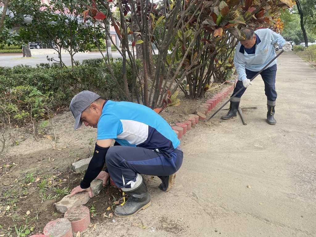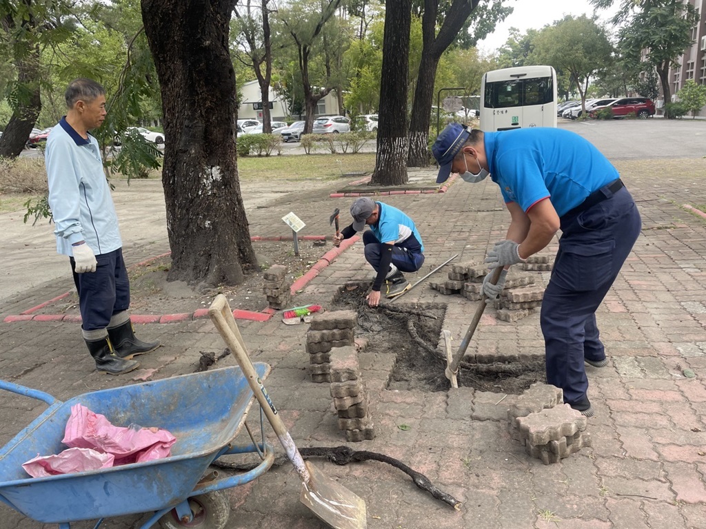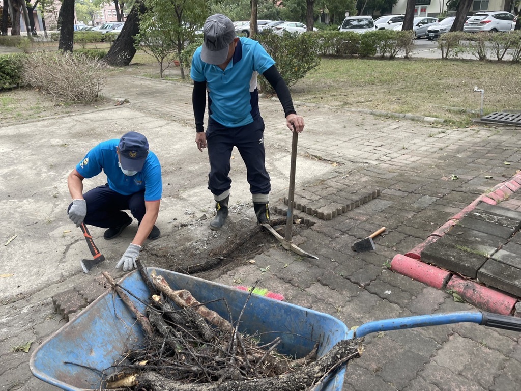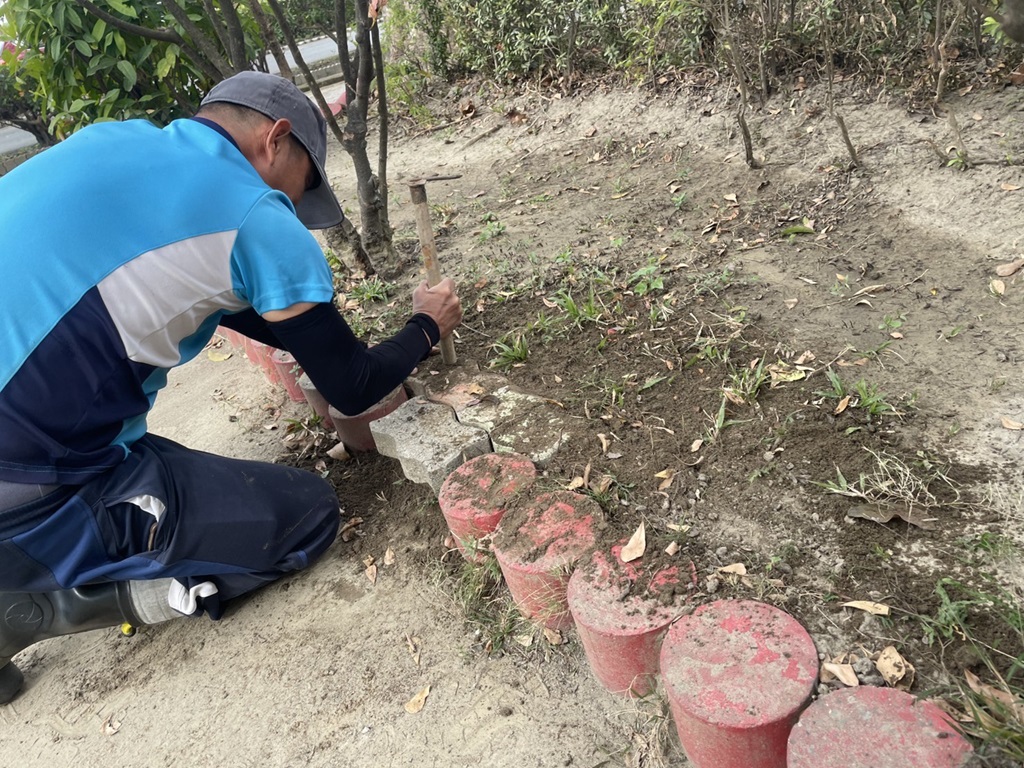 本次工程重點包括:於路緣舖設擋土磚,以預防強降雨導致土石流失、淤積排水溝渠;此外,針對因樹木根系長期竄生導致的路面隆起,同仁細心執行竄根修剪並重新舖設平整透水磚。此舉不僅有效解決了路面嚴重不平的問題,更從源頭消弭絆倒風險,全面守護同仁的行走安全。